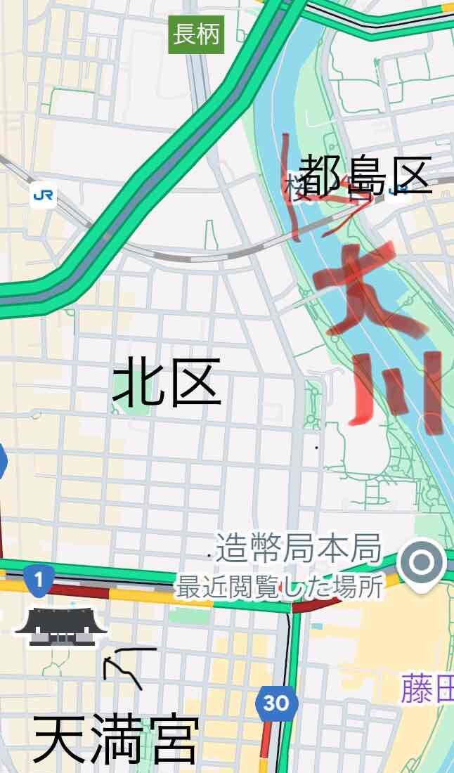 私がいつも行く観覧場所から西(地図の写真で言うと左側)は…天満や梅田の「北区」なのです。